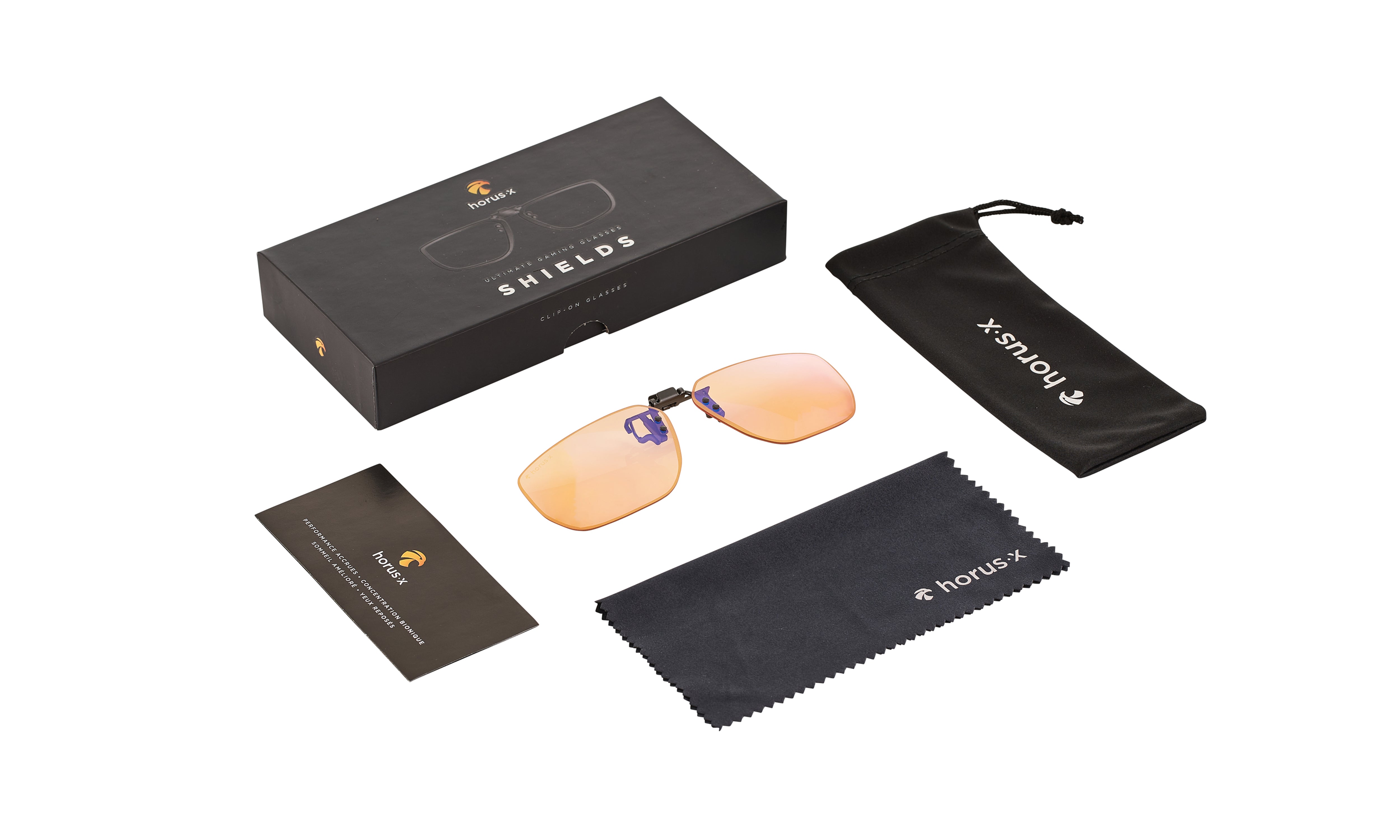 - 1 par de GAMING SHIELDS (sobregafas con clip unisex anti luz azul)