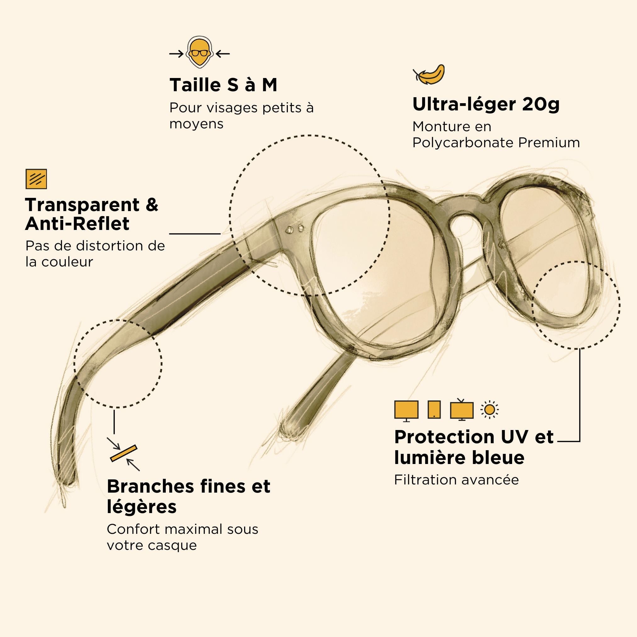 La montura de policarbonato de estas gafas anti luz azul combina resistencia y ligereza hasta el punto de que te olvidarás de que las llevas puestas. El revestimiento especial ofrece un acabado suave y agradable al tacto para proteger tu nariz y tus bonitas orejas. Finalmente, las bisagras flexibles dejan espacio para que tu rostro se asiente en la mejor posición posible sin sentir presión en las sienes. ¡Talla única para la mayoría de caras!