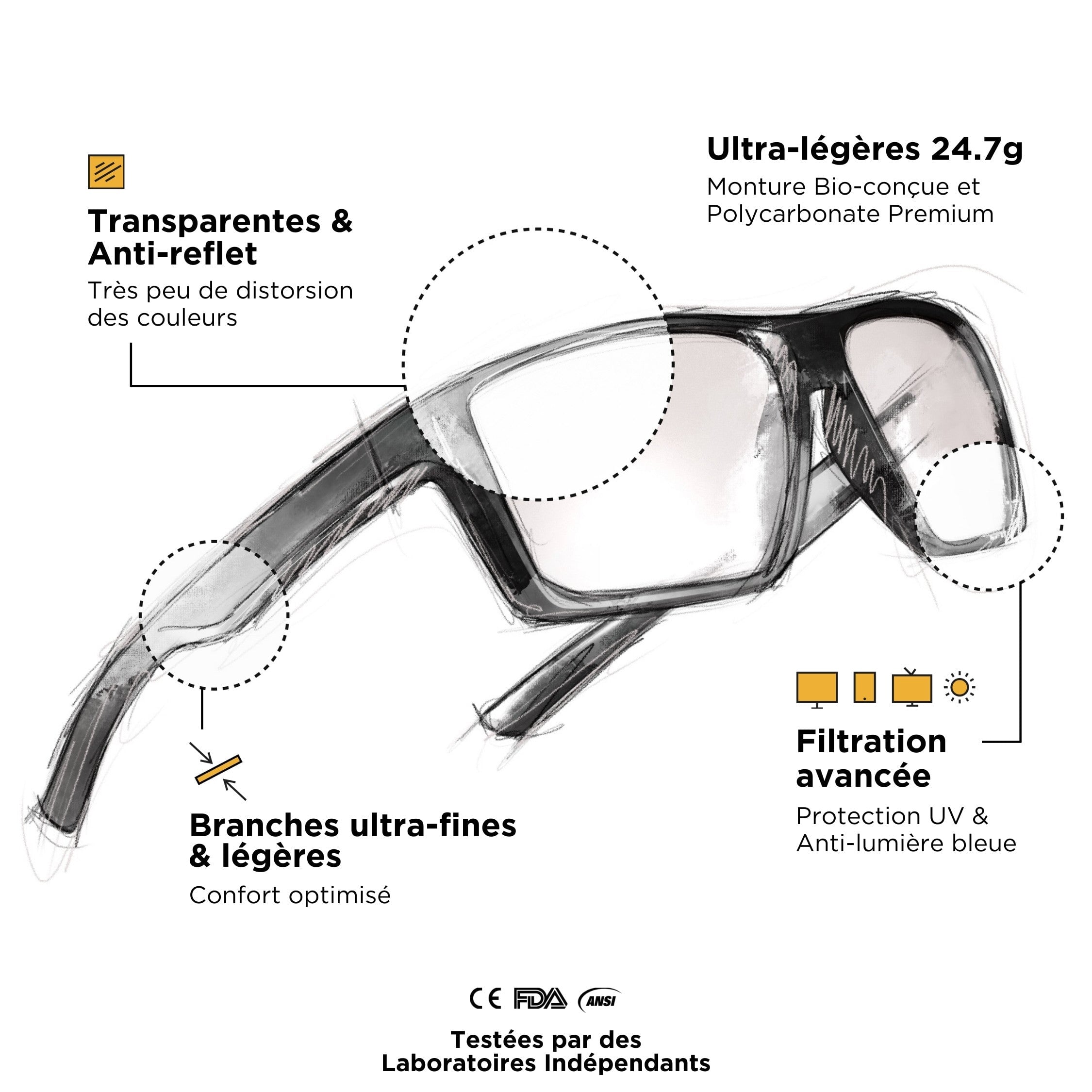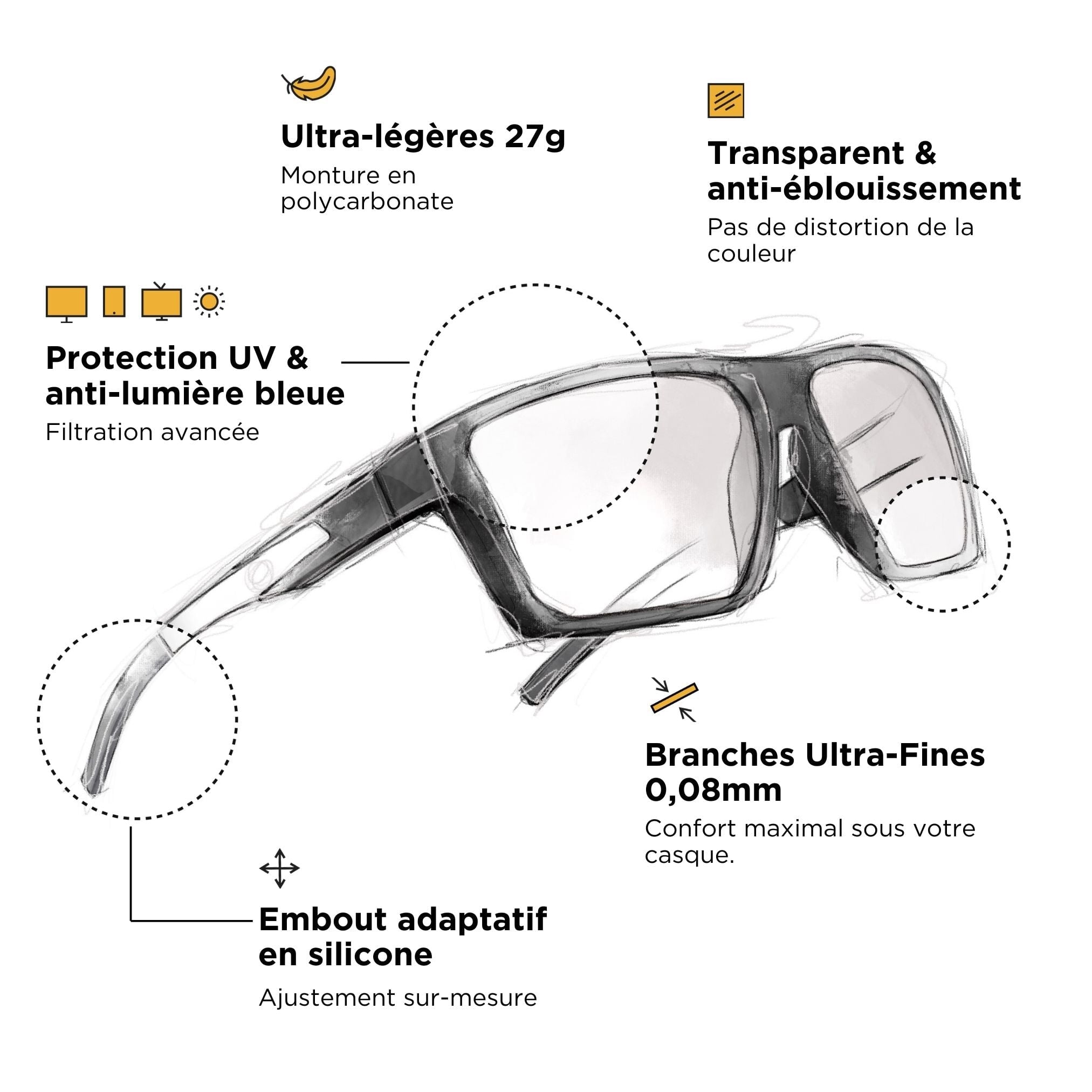 Hemos trabajado muy duro para equipar nuestras gafas gaming Horus X con los mejores materiales. Patillas y lentes de policarbonato, materiales ultraligeros y suaves. Comodidad inigualable, optimizadas para usarlas con auriculares de tipo casco.